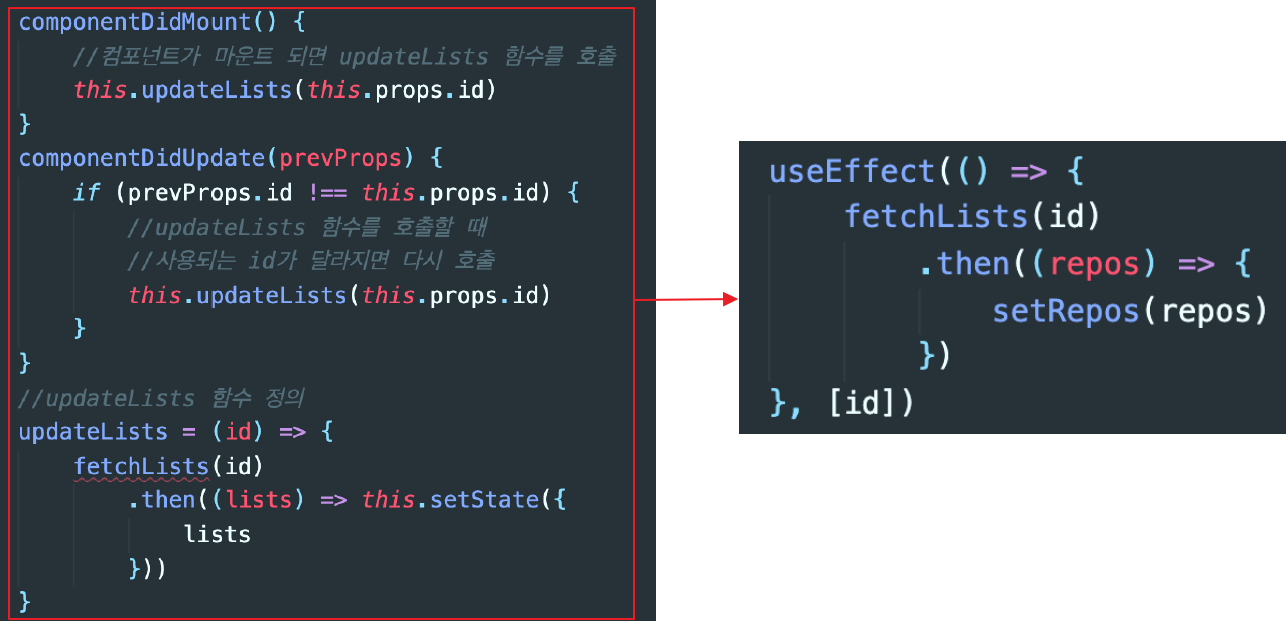 클래스 컴포넌트에서는 생명주기를 이용할때componentDidMount,ComponentDidUpdate,componentWillUnmount로 다르게 처리를 한다.- 리액트 훅을 사용한